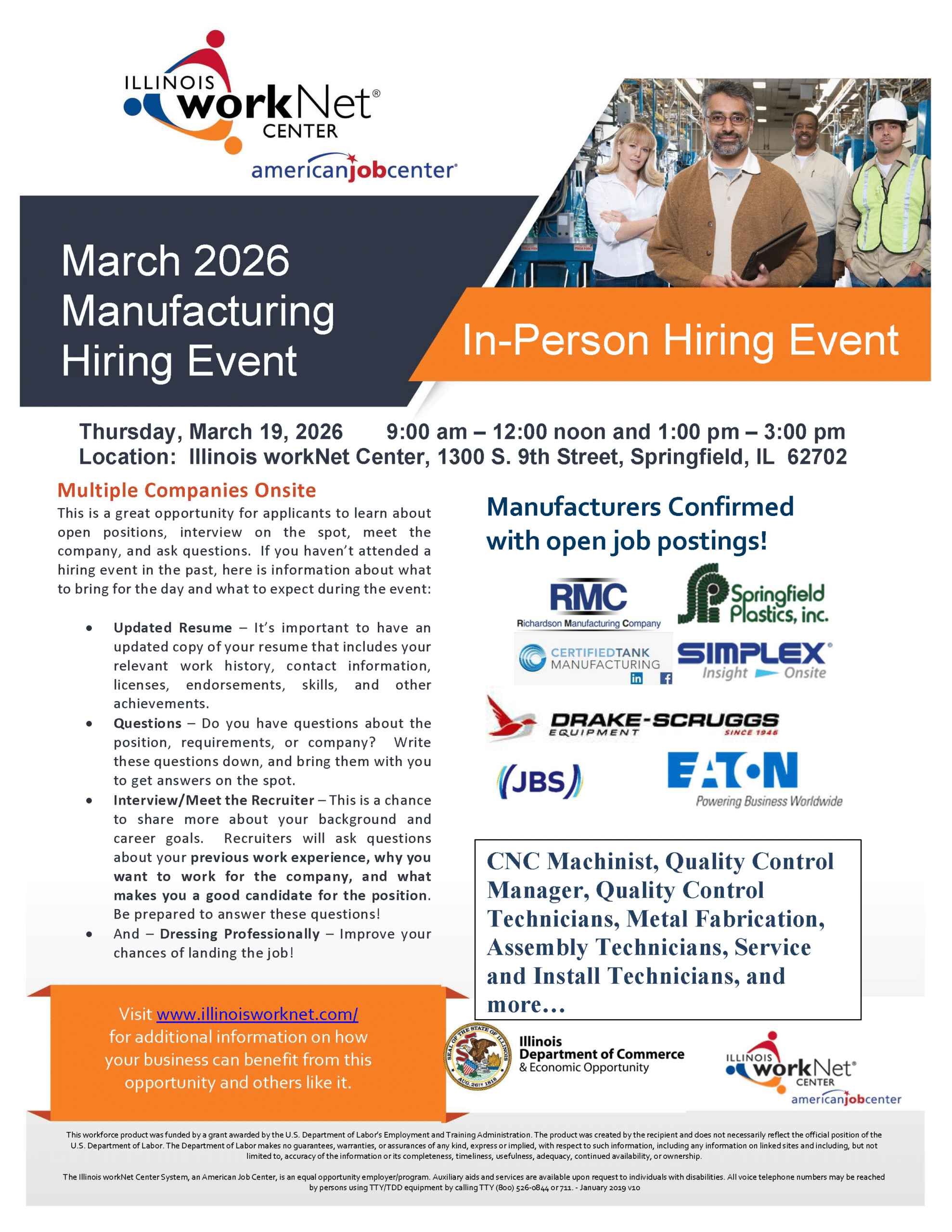 There will be two sessions: 9:00 a.m. to 12:00 p.m. (noon) and also from 1:00 p.m. to 3:00 p.m. The event will be held at the Illinois workNet Center in Springfield (1300 South 9th Street, Springfield, IL 62703).